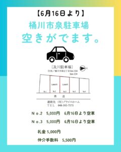 2026年3月20日 / 最終更新日時 : 2026年3月20日 pricehome お知らせ 【駐車場】桶川市泉 6月16日より空きが出ます。 No.2 5,000円 6月16日より空車No.3 5,000円 6月16日より空車 ご案内はこちら⇩ 桶川市駐車場のご案内