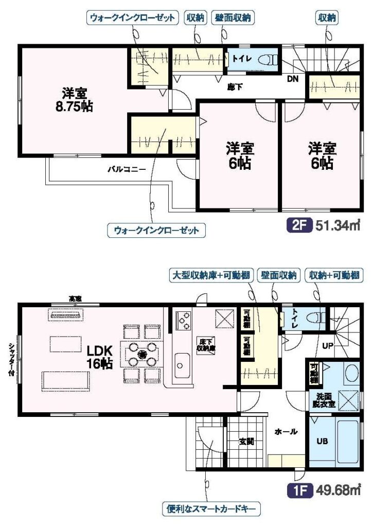 〇2階はダブルウォークインクローゼットと廊下に収納部分、1階にはコートクロークも兼ねた大型収納庫がございます。